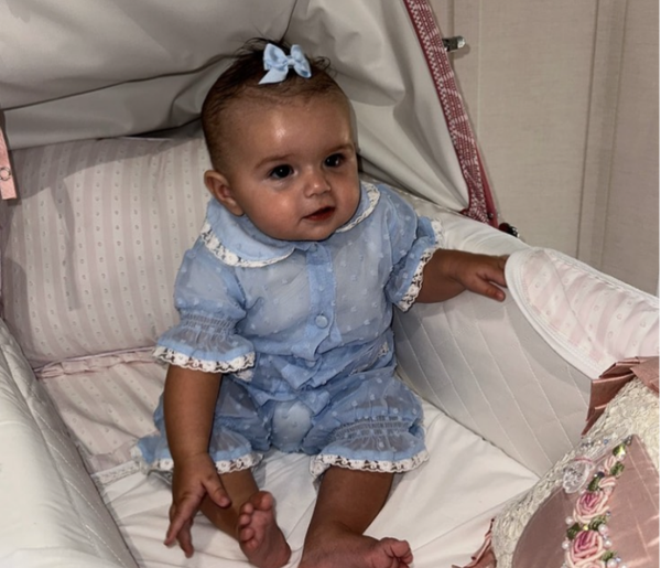 Girls blue Swiss dot. 3/4 legs , short arms